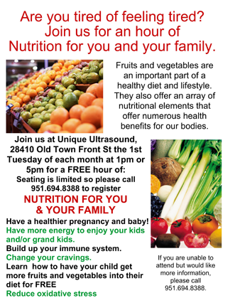 Every first Tuesday of the month we, at Unique Ultrasound, host a free seminar on nutrition, focused on having a healthier pregnancy and baby! Join us at 28410 Old Town Front St in Temecula for this free, life changing event. Call (951)694-8388 or email info@uniqueultrasound for more info.