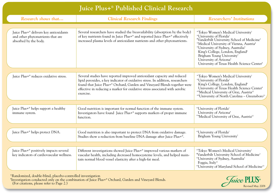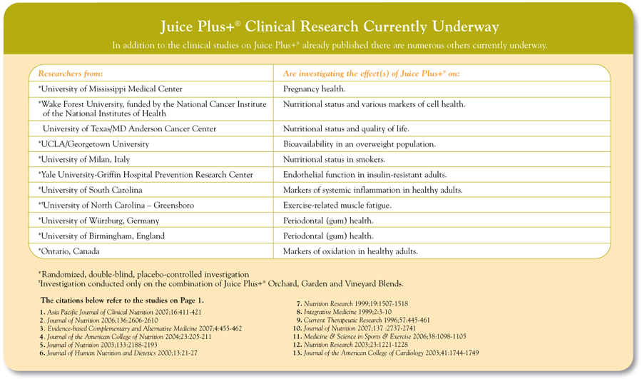 Dr. Odom offers a simple explanation: “Healthier moms have healthier babies.” Dr. Odom presented these findings to his medical colleagues at the annual meeting of the Central Association of Obstetricians and Gynecologists in October 2003. The findings are also being published as a “retrospective descriptive analytic comparison” in the March 2006 issue of JANA, the Journal of the American Nutraceutical Association. More importantly, Dr. Odom’s findings have led to the initiation of a methodologically rigorous (prospective, doubleblind, placebo-controlled, and randomized) clinical trial of the impact of Juice Plus+® on pregnancy health currently underway at the University of Mississippi Medical Center in Jackson. “I am pleased to see that what I observed in our practice is now being taken to the next level of scientific investigation by my academic colleagues.